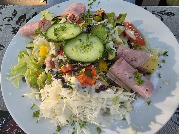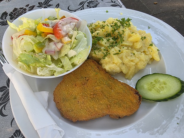 Andreas I nahm als Vegetarier das Gemüseschnitzel mit Kartoffelsalat und einem Beilagensalat. Andreas II entschied sich für einen reinen Salatteller mit Schinken und dazu Toastbrot.