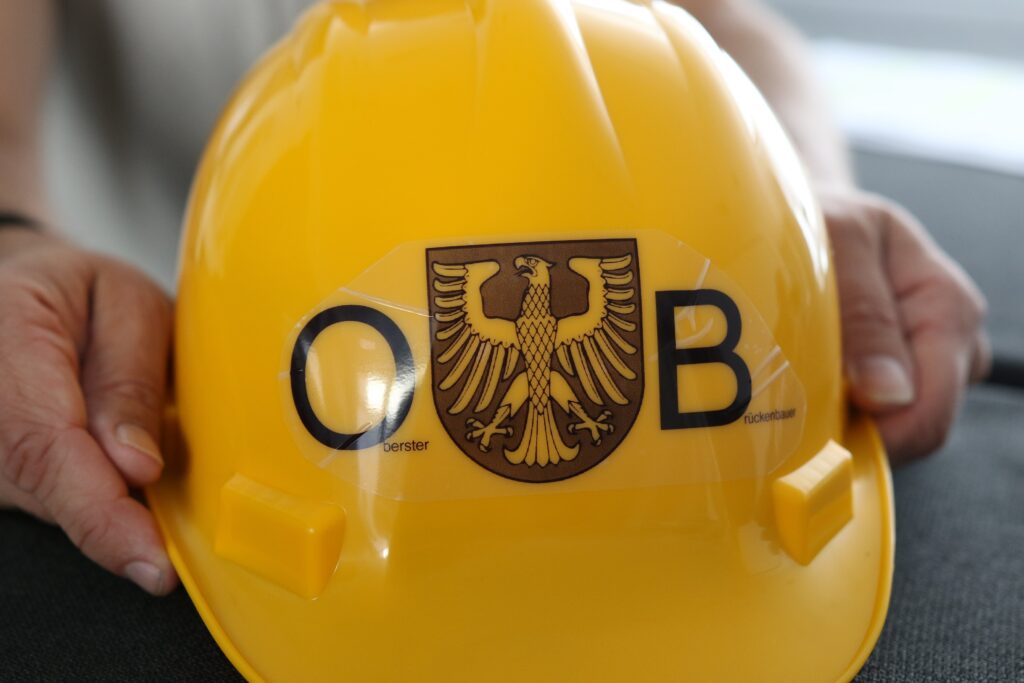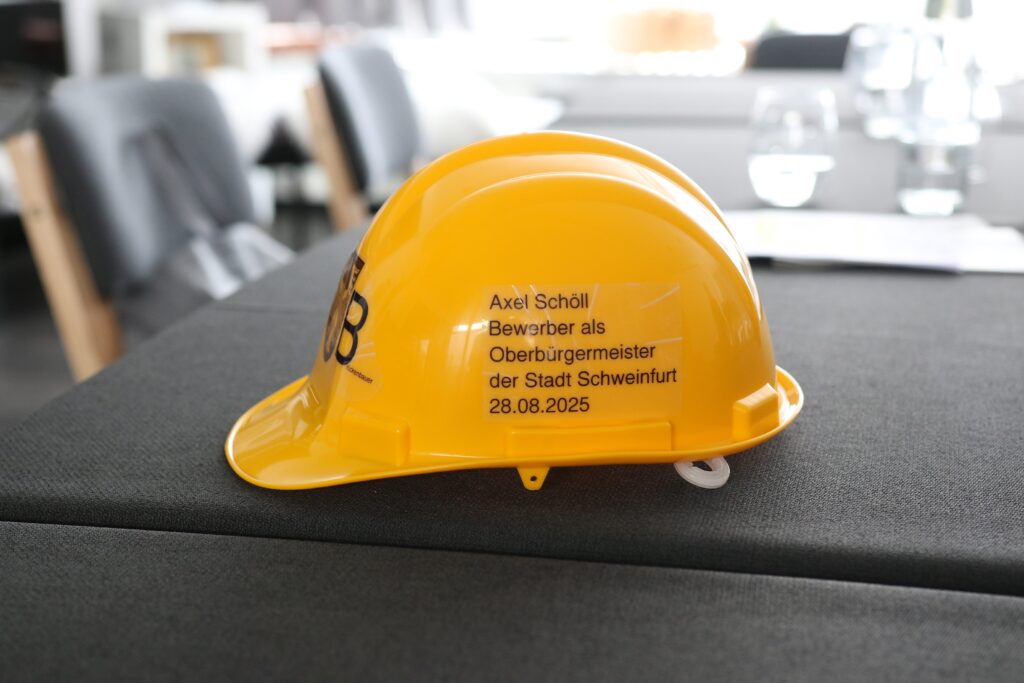 Wie Bob, der Baumeister“ kommt Axel Schöll daher mit seinem extra angefertigten (und natürlich gelben) Helm, auf dem das „OB“ neben dem Stadtwappen allerdings für „Oberster Brückenbauer“ steht. Gegen die Politikverdossenheit in der Stadt Schweinfurt will er ankämpfen, natürlich auch gegen die wachsende Beliebtheit der AfD.