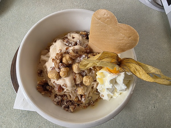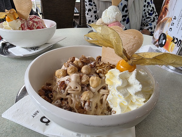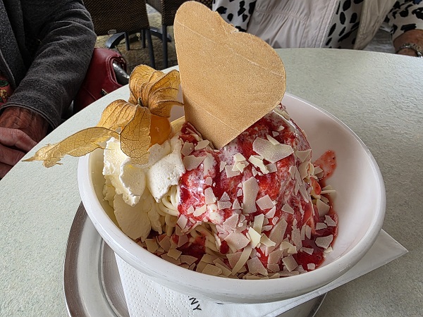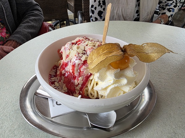 Und schlemmten drei verschiedene Eisbecher, zweimal das Spaghetti-Eis, einmal in der Version Carbonara und einmal Classico. Und beim gemischen Eis kamen die Sorten Erdbeere, Joghurt und Haselnuss in den Becher. Mutmaßlich sieht man auf den Fotos, das alles wunderbar schmeckte in den laut Aussagen vieler Schweinfurter besten Eisdiele der Stadt.