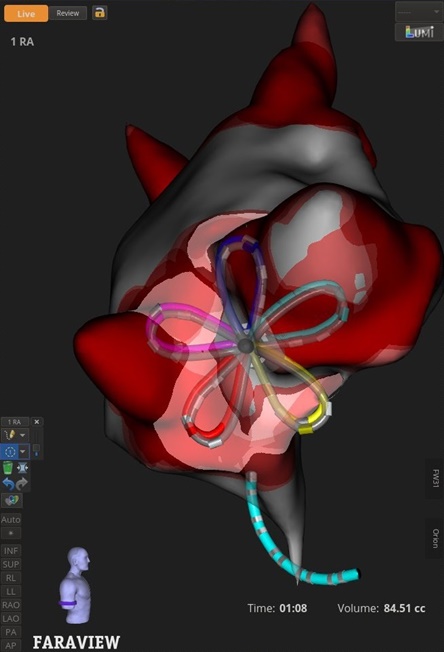 Der PFA-Katheter – hier in der blumenförmigen „Flower-Konfiguration“ – kann innerhalb der 3D-Landkarte des linken Vorhofs zielgenau gesteuert werden. Die rot gefärbten Bereiche sind die Regionen, die bereits mittels PFA behandelt wurden. Der Katheter ist im Bild in Richtung der rechten Lungenvenen orientiert.