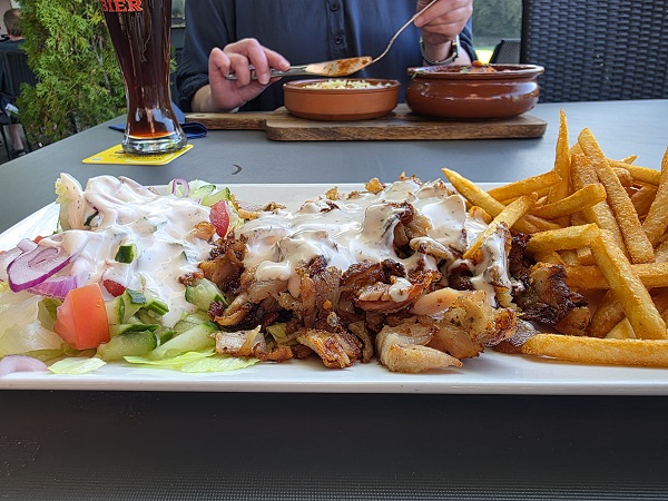 Michael blieb zu ein paar Schwarzbieren der Brauerei Mönchshof aus Kulmbach, die in Weizengläsern der Schweinfurter Brauerrei Roth ausgeschänkt wurden (man stelle sich das mal im Sachs -Stadion vor…) ganz klassisch für den Drehspießteller, Hähnchen- und Putenfleisch mit Pommes Frites, Zwiebeln und Kräutersoße und dazu Gurken-, Tomaten- und einen Eisbergsalat. Ebenso zum Reinlegen!