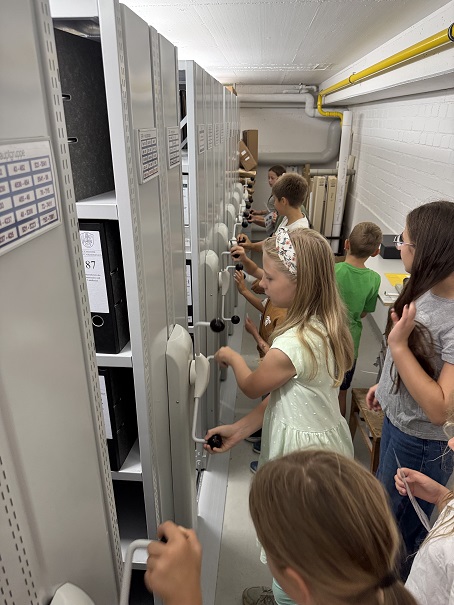 Anschließend haben alle gemeinsam das ganze Rathaus erkundet. Von Abteilung zu Abteilung, überall haben die Kinder hineingeschaut und viele Eindrücke gesammelt. Die langen Reihen von Aktenordnern, die verschiebbaren Archivschränke und die große Sammlung von Schlüsseln haben sie besonders beeindruckt. Für einen echten Höhepunkt hat der Zufall gesorgt: Genau in dem Moment, als die Gruppe im Bürgerbüro war, hat der Gemeinderat und Seniorenbeauftragter Mathias Kupczyk seinen neuen Ausweis beantragt. Die Kinder konnten dabei zuschauen, wie das Foto gemacht, Fingerabdrücke genommen und der Ausweis bestellt wurde – ein Erlebnis.