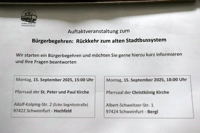 Am kommenden Montag schon, 15.09., finden zwei Auftaktveranstaltungen statt zum Bürgerbegehren „Rückkehr zum alten Stadtbussystem“. Und zwar um 15 Uhr im Pfarrsaal der Sr. Peter und Paul-Kirche in der Adolf Kolping-Straße am Hochfeld und dann um 18 Uhr im Pfarrsaal der Christkönig-Kirche in der Albert Schweitzer-Straße am Bergl.