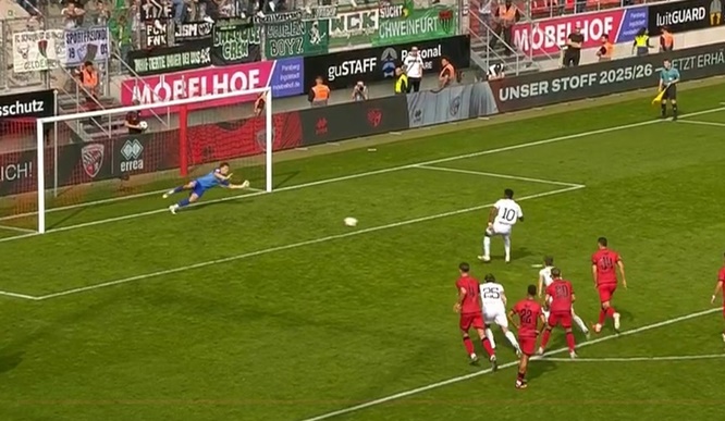 Und dann wurde es aufregend, höchst erfreulich, danach ärgerlich im ziemlich leeren Stadion mit seinen 3790 Zuschauern. Der Reihe nach: Schlenzen kann Manuel Wintzheimer – in der 54. Minute war das das 2:2. Alles nun gut? Ja! Und nein. Denn nach Foul an Bausenwein gab´s Elfmeter für die Schweinfurter. Diesmal trat Michael Dellinger an….