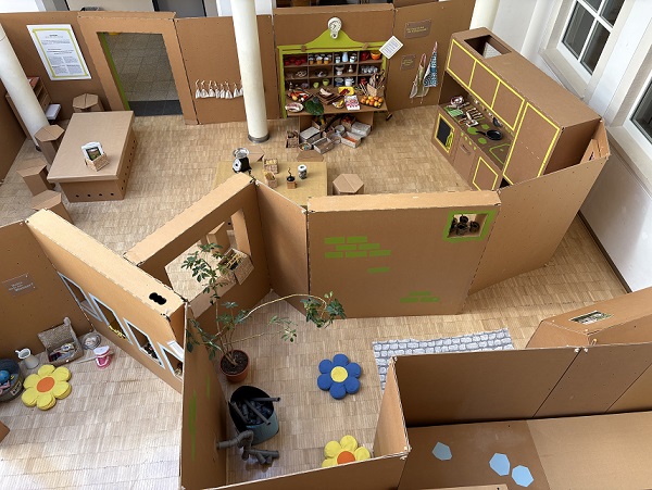 Die Ausstellung besteht aus vier Zimmern – einem Bad, einer Küche, einem Kinderzimmer und einem Wohnzimmer. Innen ist es ein bisschen wie in jeder Wohnung – und doch anders. Denn die Wände und Möbel sind komplett aus Pappe. Und in jedem Raum gibt es aktiv Dinge zu entdecken, die es in einer gewöhnlichen Wohnung nicht gibt. Vom Klo aus kann man ins Abwasserrohr steigen. Durch die Riesensteckdose kann man durchschauen. Und im Küchenschrank legt ein Huhn ein Ei – zum Glück direkt in die Bratpfanne. Viele weitere ungewöhnliche und spannende Sachen regen kleine und große Besucher dazu an, sich spielerisch mit Fragen der nachhaltigen Entwicklung zu beschäftigen.