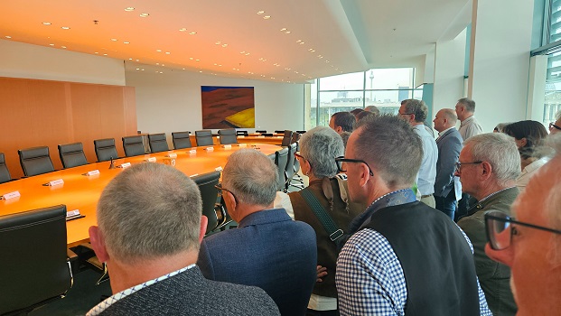 Das Bundeskanzleramt steht Besuchern normalerweise nicht offen. Für die Delegation aus dem Landkreis Bad Kissingen gab es jedoch eine Ausnahme. Und so konnten die Teilnehmenden einen Blick ins Herz des Kanzleramts werfen – dorthin, wo zentrale Entscheidungen diskutiert und getroffen werden: in den Kabinettssaal. „Natürlich werden hier Protokolle geführt, aber die sind streng geheim und dürfen erst nach 30 Jahren der Öffentlichkeit zugänglich gemacht werden“, erklärte die Besucherführerin.