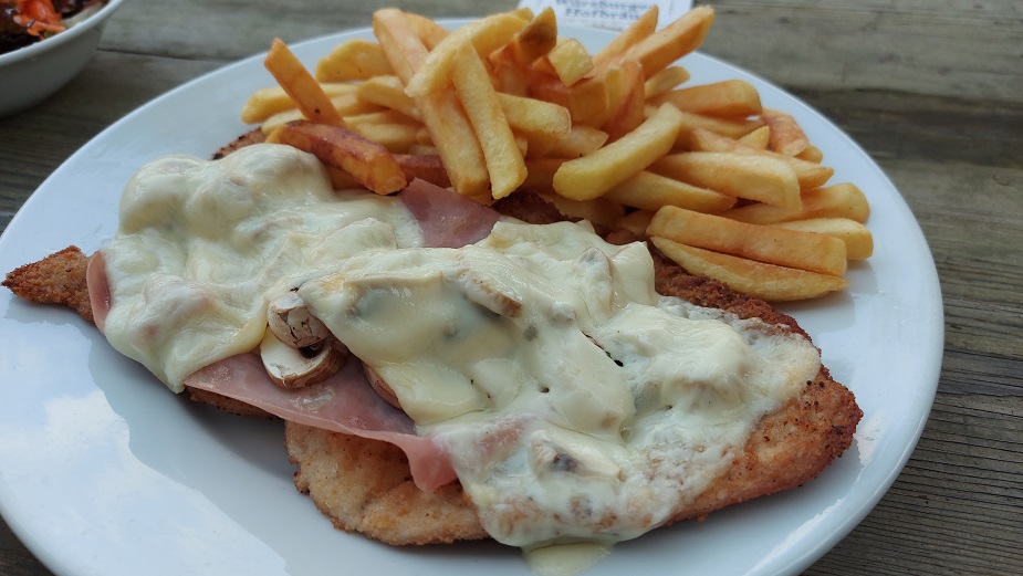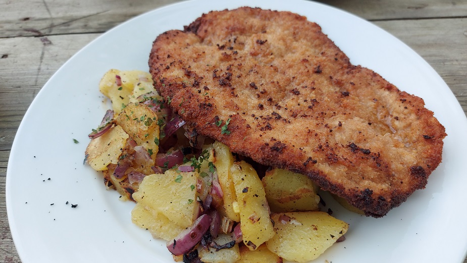 Die gab´s als Beilage auch zum klassischen Wiener Schnitzel mit den Bratkartoffeln und zum mit Champignons, Käse und Schinken überbackenen Schweineschnitzel mit Pommes Frites.
