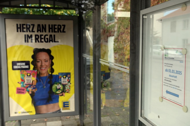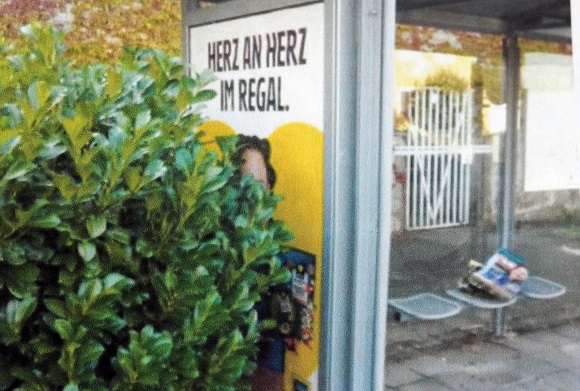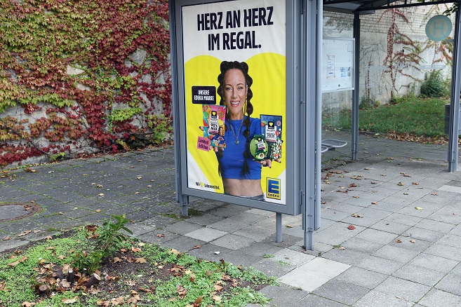Fassen wir zusammen: Vor einem Bushäuschen außer Betrieb mit Werbung wird extra ein immergrüner Busch entfernt, während knapp 200 Meter weiter für eine stark frequentierte Haltestelle Reklame gesucht wird. Mit nur einem kleinen bisschen Grips hätte man ja auf die Idee kommen können, Blümchen einfach zu versetzen. Also: Keine echten Blümchen, sondern die EDEKA-Botschaft von Jasmin Wagner. Und deren Plakat. Von Bushalt 1 zu Bushalt 2.