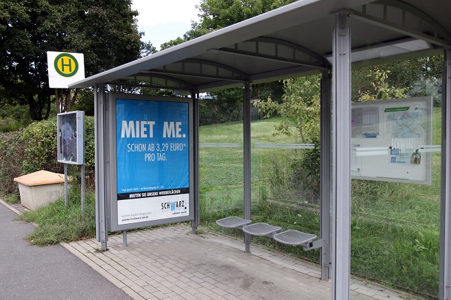 Dass die Haltestelle still gelegt wurde und entsprechend im Häuschen niemand mehr auf den Bus wartet, ist das eine. Die nächste Buswartestelle Albertistraße Richtung Wildpark ist das andere Thema. Dieser Haltepunkt befindet sich noch im Betrieb. Doch da steht auf der nicht vermarkteten Werbetafel „Miet me“. Konkret: Die Stadtwerke beziehungsweise die Schwarz Aussenwerbung GmbH suchen dort nach einem Unternehmen, das Reklame machen möchte.