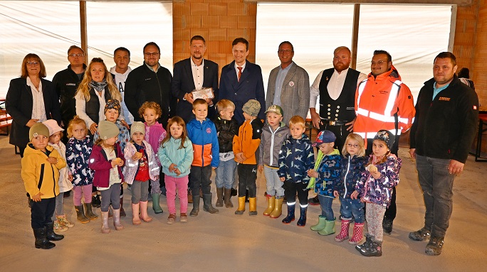 Landrat Florian Töpper freute sich über ein Oktoberfest der besonderen Art. Fertig gebaut ist die Hülle des Gebäudes. Kinderbetreuung ist heute mehr als Verwahrung, betonte er. Entscheidend sei was drinnen geschieht. Er erinnerte an die zugesagten 200.000 Euro an Leader-Mitteln der EU, die vor allem der Inklusionsförderung der Kita geschuldet sind.