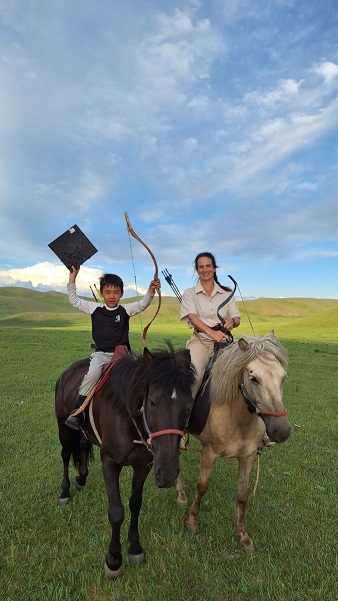 Letzte Station der Weltreise war die Mongolei. „Wir haben tatsächlich in einer Jurte gewohnt und von unserer Gastfamilie auch vergorene Stutenmilch angeboten bekommen.“ Letztere sei nicht unbedingt ihr Geschmack. Bei einem Fest habe es spannende Wettbewerbe im Reiten, Ringen mongolischer Art und im Bogenschießen zu bewundern gegeben. „Ich habe dann gefragt, ob man das Bogenschießen auch als Ausländer erlernen kann.“ Das Ergebnis: Die beiden Deutschen wurden in ein Camp eingeladen, im traditionellen Reiten im Stehen und im Bogenschießen vom Pferd aus unterrichtet.