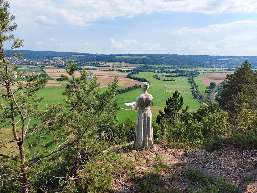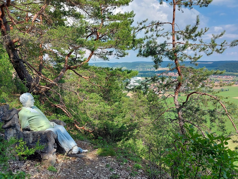 Und dann gibt´s eben diese geheimnissvollen Figuren am Wegesrand, die vom Hang nach unten schauen, die angeblich von heute auf morgen dort auftauchten, ohne dass jemand weiß, wer sie dorthin brachte. Zunächst war da eine Frauen-Statue mit angeblich gut 250 Kilo Gewicht, mit einem Buch in der Hand. Amalberga wurde sie genannt. Rund 100 Meter entfernt tauchte danach ein noch schwerer, sitzender Mann auf. Philosoph tauften die Hammelburger ihn, auch wenn er irgendwie wie Goethe ausschaut.