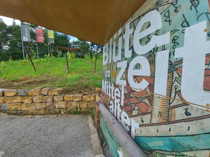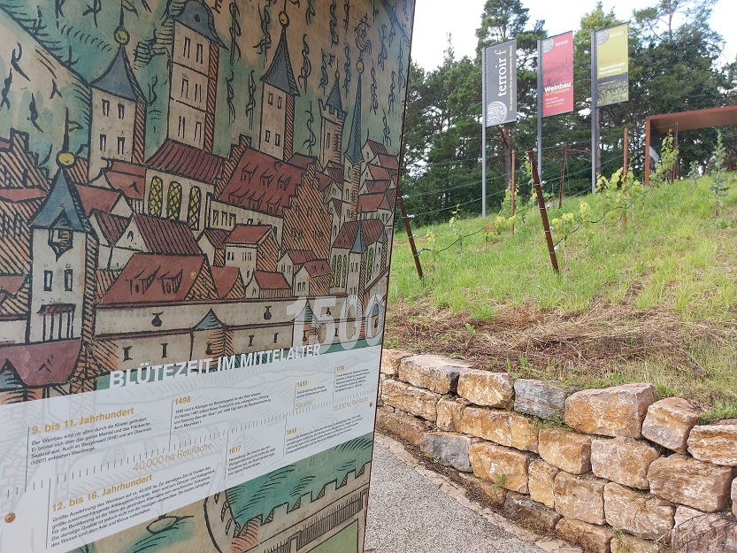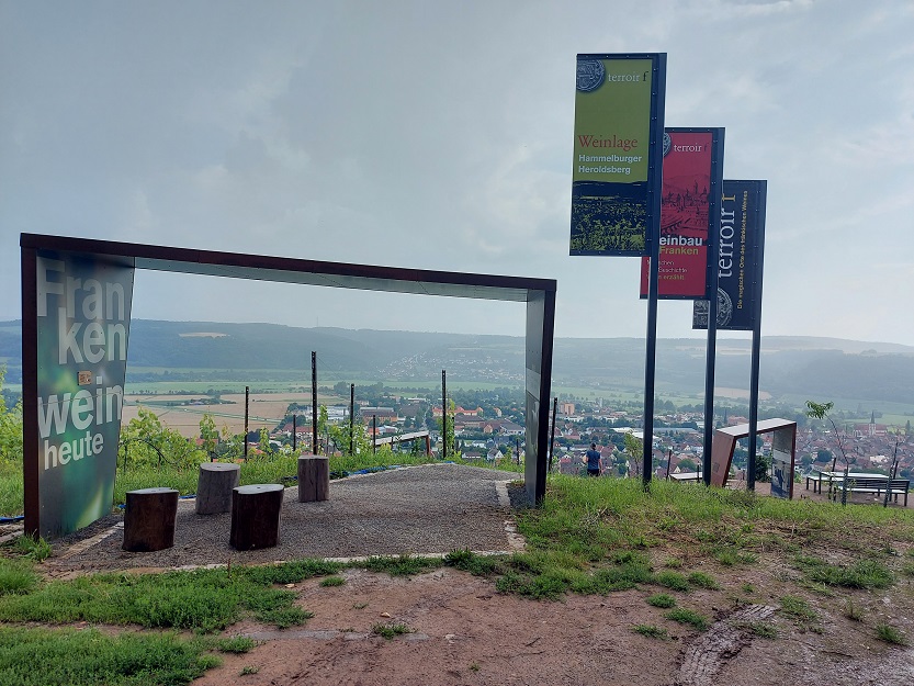Erstens: „terroir f”: In der Lage Hammelburger Heroldsberg befindet sich der Magische Ort zur Geschichte des Frankeweins. Vier architektonisch gestaltete Hörstationen – beim Besuch ideal aufgrund plötzlich einsetzenden Starkregens, weil überdacht – informieren. Gleichzeitig hat man hier einen tollen Blick auf die älteste Weinstadt Frankens.