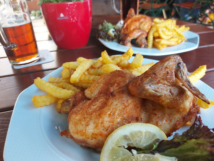Zur Einkehr bietet sich das Gasthaus zum Adler im benachbarten Ort Langendorf an. In der Hauptstraße versteckt sich hinter dem zunächst unscheinbaren Gebäude ein wunderbarer Biergarten mit einer Kaminscheune, mit einer vorzüglichen Bierauswahl und gutbürgerlichen Speisen. Sehr zu empfehlen ist das knusprige halbe Hähnchen mit Pommes an einem jeden Freitagabend.