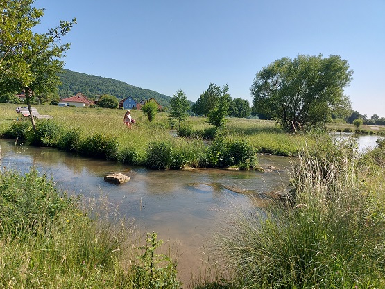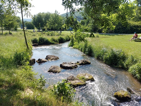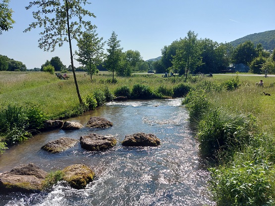 Vier mal überquert man sie dabei und kommt an zahlreichen romantischen Stellen vorbei, an Sitzmöglichkeiten am Wasser, an Gelegenheiten, die Füße ins Nass zu halten oder sogar im Fluss herumzulaufen, neben badenden und auf den Wiesen sich ausruhenden Tieren. Einige sehenswerte Gebäude gibt es in Ebermannstadt natürlich auch – und ein recht belebtes Zentrum mit zahlreichen Einkehrmöglichkeiten.