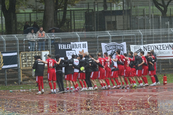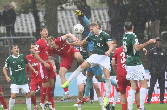 Und natürlich hat er Recht. Jakob Tranziska lief schon vor seinem 1:0 in der 38. Minute zwei Mal alleine auf´s Tor zu und scheiterte. Sebastian Müllers Kopfball nach einer Stunde landete nach Freistoß von Christian Böhnlein am Pfoten. Danach – eines unserer Bilder beweist es – zog Qualid Mhamdi ungeahndet Lucas Zeller am Trikot. Es hätte locker mindestens 3:0 stehen können, ehe mit Chilohem Onuoha und Julian Stark zwei eingewechselte Verler in der 78. und 88. Minute die Partie komplett kippten. Nach dem 1:1 lautete das Eckenverhältnis 1:10…