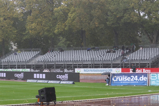 Gruselwetter, klar. Aber selbst der Dauernieselregen hätte viele Fußballfans wohl nicht abgehalten, wenn der FC 05 nicht so schlecht gestertet wäre, bislang alle Heimspiele vergeigt und zuletzt zwei Mal nacheinander mit 1:5 verloren hätte. So waren es am Samstag nur noch 1938 Zuschauer. Die drei neuen Sitztribünen: Gähnend leer!