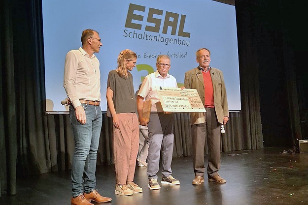 - ESAL übergibt bei der Jubilarfeier einen Symbolscheck an die Werkstatt für behinderte Menschen Augsfeld (v. l.): Thorsten Kamm, Anika Kamm und Josef Kamm, die Geschäftsführung der Firma ESAL, und Konrad Schneider, der stellvertretende Vorsitzende der Lebenshilfe Schweinfurt.