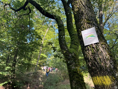 Nach dem Empfang mit regionalem Secco und Zwiebelkuchen startete die Wandergruppe unter Führung der Naturpark-Ranger Alexander Schneider und Verena Kritikos in Richtung Zell am Ebersberg. Revierförsterin Ellen Koller von den Bayerischen Staatsforsten begleitete den ersten Abschnitt der Wanderung und gab unterwegs informative Einblicke in die Geologie am Wegesrand sowie den Naturwald Knetzberge-Böhlgrund. Auf der „Steigerwald-Runde Schlangenweg“ ging es auf halber Höhe entlang von Schluchten und Bachtälern durch den herbstlichen Wald, wo sich nicht nur Spuren des Künstlers herman de vries, sondern auch eine Fülle von Pilzen am Wegesrand entdecken ließen. Nach dem steilen Aufstieg zum Beerberg ging es übers Rennerkreuz zurück zum Ausgangspunkt der insgesamt gut 12 km langen Wanderung.