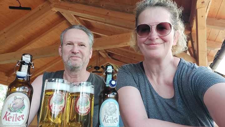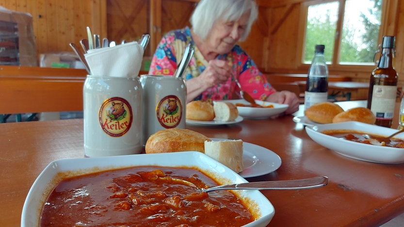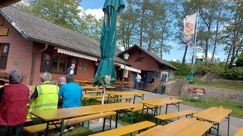 Belohnt wird man mit einem schönen Angebot an Speisen und Getränken. Natürlich gibt´s Kaffee und Kuchen, aber auch die guten Keiler-Biere. Und auch immer ein warmes Essen, diesmal Spießbraten im Weck und einen Fleischtopf mit Brötchen. Das war lecker!