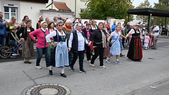 Die Fichtenburschen, Promis, mehrere Gruppen der Kita Storchennest (angeführt von Carolin Fiedler und Karin Lommel), die Tanzkinder um Katja Karch und Christine Lenhard, die Rundentänzer/innen des TSV um Lewin Pelka, die ebenfalls durch Karin Birkner mit Blumenkränzchen dekorierten Seniorinnen um Elisabeth Ankenbrand, Tanzpaare und zwanglos sich anschließende Erwachsene, Jugendliche und Kinder folgten. Nächste Station: das Gasthaus Straub. Auch hier Baumaufstellung, ein paar Lieder der Kapelle und ein Hoch auf die Wirtsleute Jürgen und Christiane Straub.