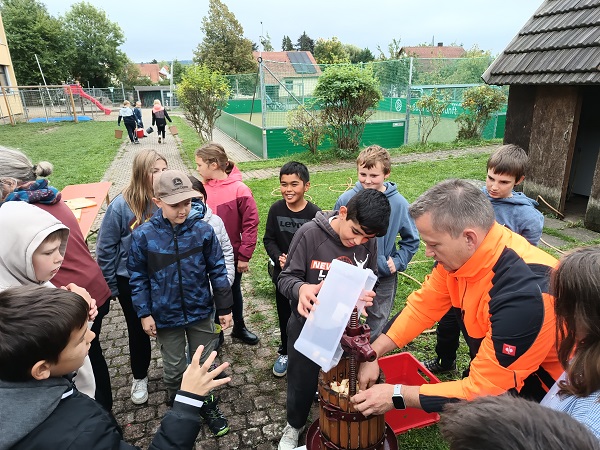 Nach der Ernte begann die Verarbeitung. Zunächst wurden die Äpfel geviertelt, bevor sie in einer Obstmühle zu Maische zerkleinert wurden. Diese kam schließlich in die Obstpresse – auch hier half Hausmeister Herr Walter tatkräftig mit. Das Ergebnis ließ nicht lange auf sich warten: Der frisch gepresste Apfelsaft wurde sofort verkostet – und fand großen Anklang. „Sehr lecker und gesund!“, lautete das einstimmige Urteil der jungen Erntehelferinnen und -helfer. Eine gelungene Aktion, die Natur, Praxis und Gemeinschaft auf schöne Weise verband und somit den Schülerinnen und Schülern lange im Gedächtnis bleiben wird.