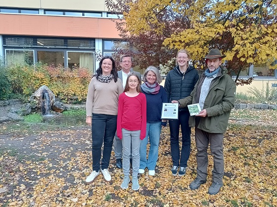 Voller Freude wurde der Entdeckerin Cilia der Erstnachweis zum Fund der Gottesanbeterin vom Naturparkranger Arno Ludwig übergeben. Auf dem Bild zu sehen (von links): Juliane Klopf (Kooperationslehrkraft Naturparkschule), Heribert Jäger (Rektor), Cilia (Entdeckerin), Sabine Schimmer (Klassenleiterin), Lisa Flachsenberger (FÖJlerin des Naturparkes), Arno Ludwig (Naturparkranger).