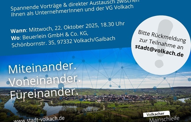 VOLKACH – „Miteinander, voneinander, füreinander!“ Nach dem großen Erfolg der Premiere des Volkacher Unternehmertreffs im April 2025 lädt die Verwaltungsgemeinschaft Volkach für Mittwoch, 22. Oktober 2025, 18.30 Uhr, zum 2. Unternehmertreff ein.
