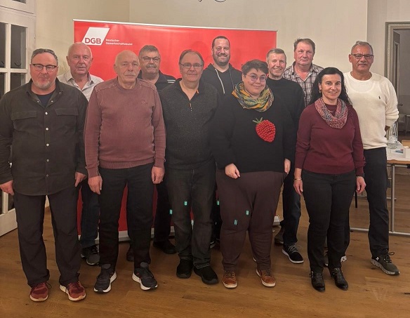 Das Gruppenfoto zeigt den neuen DGB-Kreisvorstand – von links: Thomas Hofmann (IG BAU), Siegfried Steinbach (NGG), Xaver Kerber (ver.di), Klaus Köth (IG BAU), Gerhard Klamet (IG Metall), Fabian Wiener (IG Metall), Viktoria May (GEW), Edger Schneider (IG Metall), Otmar Büttner (IG BCE), Christel Sauer (IG BCE).