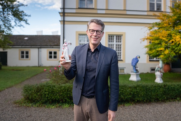 Bild 1: Kunstminister Markus Blume mit der Preisstatue des Bayerischen Kunstpreises in der Porzellan Manufaktur Nymphenburg. © Axel König/StMWK