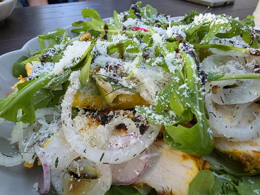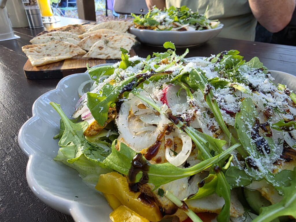 Die entschieden sich beim Essen trotz der so enorm reichhaltigen Karte für jeweils einen Geflügelsalat, der auf den Bildern bestimmt neugierig macht. Statt Weißbrot bestellten die Hungrigen Pita und wurden so endgültig restlos glücklich.