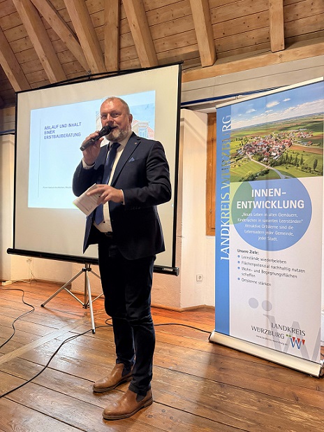 Architekt Andreas Hanisch erläuterte beim Tag der Innenentwicklung den Ablauf und Nutzen einer Erstbauberatung, die direkt vor Ort in der jeweiligen Immobilie stattfindet. Dabei werden bauliche, denkmalpflegerische und energetische Fragen ebenso betrachtet wie städtebauliche und ortsgestalterische Aspekte. Bürgerinnen und Bürger, die für ihr Projekt noch Ideen und Entscheidungshilfen benötigen, können beim Landratsamt Würzburg Beratungsgutscheine im Wert von 500 Euro beantragen.