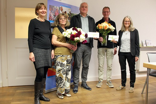 Seit 25 Jahren freiwillig für Menschen mit Behinderung aktiv: Ingrid Lauer (2. v. l.) und Reiner Rauschmann (4. v. l.) werden von Martin Groove, dem Geschäftsführer der Lebenshilfe Schweinfurt, Rita Weber (r.), der Leiterin der Offenen Hilfen, und Bettina Fünkner-Kraus, Sozialpädagogin bei den Offenen Hilfen, für ihr außergewöhnliches soziales Engagement geehrt.
