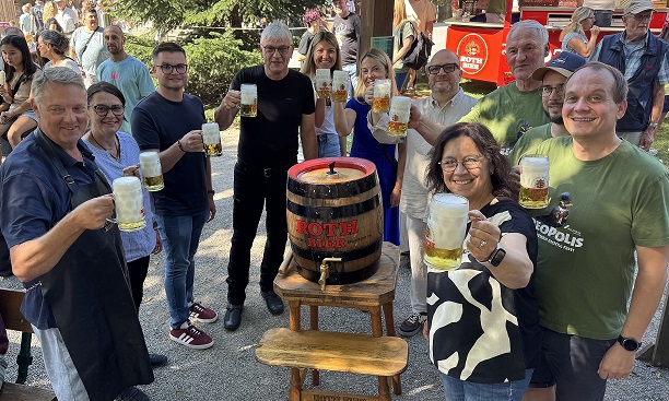 Auf dem Gruppenbild beim Bieranstich – von links: SKF-CEO Jörg Wuttke (links), die Betriebsräte Tanja Gluza, Sebastian Witzel und Norbert Völkl (Vorsitzender), Verkaufsleiterin Nadine Korell, Arbeitsdirektorin Anna Krimmel, CFO Thomas Burkhardt, Wildpark-Leiter Thomas Leier und die beiden Vertreter der Wildpark-Freunde, Maurice Breitkopf und Florian Dittert. Beim Bieranstich assistierte Schweinfurts 3. Bürgermeisterin Ayfer Rethschulte.