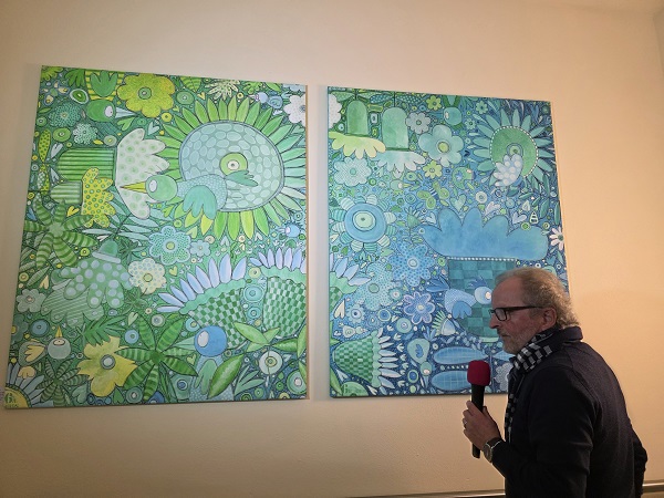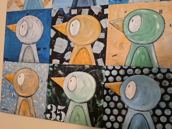 Die Bewohner hätten das Aufhängen der Bilder mit Interesse verfolgt, für sie wird es eine eigene Vernissage geben und Mitte November sogar einen Malworkshop. „Das ist dann auch das erste Mal für mich“, zeigt sich Walter Steinbeck gespannt. An sich ist er Produktdesigner, malt aber schon seit 50 Jahren. Von seinen Anfangswerken sind Antonia, die Schnecke, oder Karlchen, die Maus bekannt. Elefanten malte er auch. Aber irgendwo war immer auch ein kleiner Vogel. Nun gibt es über 70 BirdsMotive. „Leichte Kunst aus meiner positiven Phantasiewelt“ bringt er auf die Leinwand, „es sollen ja auch Kinder kommen, und da braucht es keine düsteren Bilder“.
