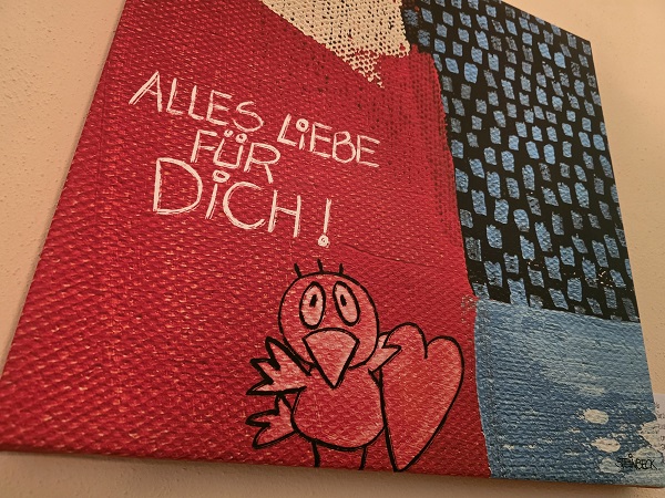 Was dabei heraus kam, ist die Ausstellung „Lass Liebe regnen“ mit zahlreichen Werken von Steinbeck. Ganz viele zeigen Vögel aus seiner Bilderserie Birds. Im Wintergarten und im Treppenhaus kann man von 01. bis 30. November bei natürlich freiem Eintritt alle Werke sehen.