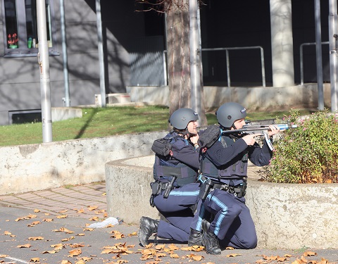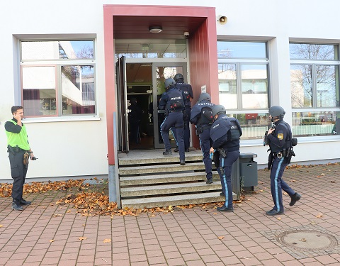Sowohl am Montag als auch am Dienstag wurde im Gymnasium Gerolzhofen geübt. Circa 80 Polizeibeamtinnen und Polizeibeamten aus der Region Main-Rhön übten sogenannte „Lebensbedrohliche Einsatzlagen“. Ziel der Übung war es, möglichst realistische Szenarien zu simulieren, welche die Übungsteilnehmer mit den Herausforderungen konfrontierte, die in komplexen und hochriskanten Situationen auftreten können. Den Gegenpart zu den Einsatzkräften, mimten bis zu 30 sogenannte Störer, welche ebenfalls durch Polizisten gespielt wurden.