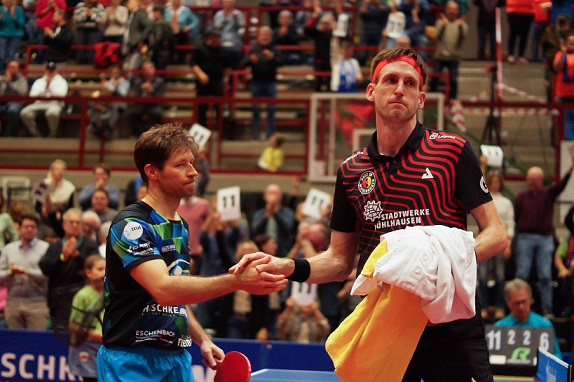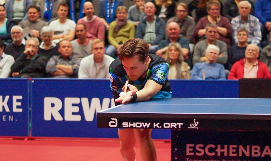 Diese Unterstützung war für Filip Zeljko im vierten Einzel gegen den von Borussia Düsseldorf gekommenen Kai Stumper (22) auch da – und bitter nötig. Sie reichte aber dennoch nicht zu einem Sieg, weil der Neu-Mühlhausener manchmal über sich hinauswuchs, alles, aber auch alles noch schärfer und platzierter zurück brachte, was Zeljko ihm hinüber knallte. Ein formidables Hochgeschwindigkeits-Tischtennis von beiden, bei dem Stumper phasenweise außerirdisch spielte.