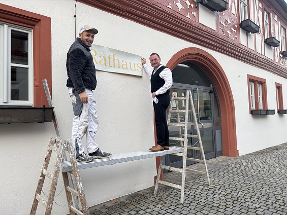 GRAFENRHEINFELD – Mit der Anbringung der neuen Rathaus-Beschriftung sind die Außensanierungsarbeiten am historischen Rathaus bald endgültig abgeschlossen.