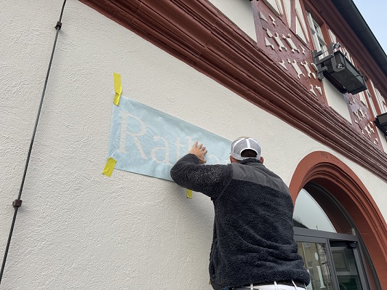 Für die abschließende Arbeit ist Sascha Barth, Inhaber der Maler- und Verputzerfirma Barth aus Röthlein, nach Grafenrheinfeld gekommen. Mit einer präzise angefertigten Schablone hat er die neue Beschriftung an der frisch sanierten Fassade angebracht.