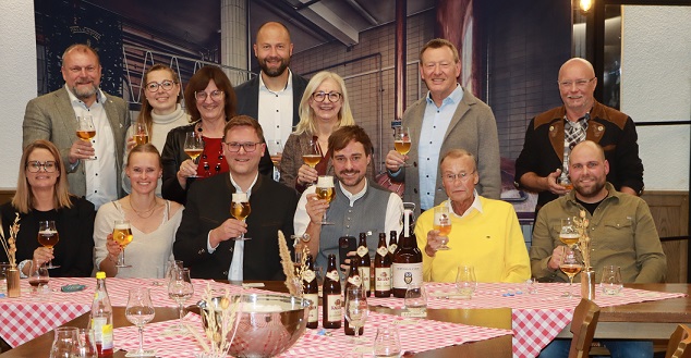 Auf dem Gruppenbild: Anstoßen auf ein gelungenes Kauzen Hopfen Pils – hinten von links: Landrat Thomas Eberth, Katharina Schmid (Geschäftsführung Stadtmarketing Ochsenfurt), 2. Bürgermeisterin Ochsenfurt Rosa Behon, Sascha Genders (Hauptgeschäftsführer IHK Würzbug), Susanne Knof (Bürgermeisterin Obernbreit), 1. Bürgermeister Ochsenfurt Peter Juks, Christian Maurer (Bereichsleiter Infrastruktur/ CIO IHK Würzburg) (vorne von links): Stefanie Pritzl- Sauer, Franzisca Köhler, Braumeister Markus Lifferth, Jacob und Karl-Heinz Pritzl, Pascal Gedrat – alle Kauzen Bräu