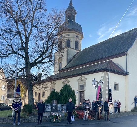 Auch in Dürrfeld wohnten am 16.11. am Vormittag nach dem Gottesdienst die Vertreter der Soldatenkameradschaft und rund 25 Dürrfelder Bürger der Feier bei. Die Ansprache hielt 2.Bgm. Artur Kloß, die Fränk. Trachtenkapelle begleitete die Feier instrumental.