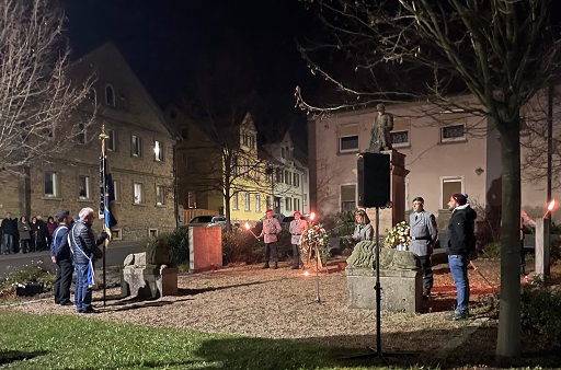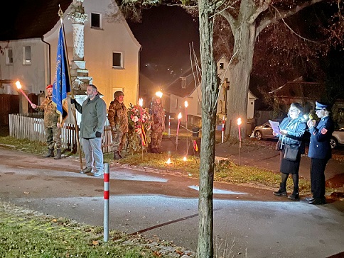 Am 16.11. abends kamen etwa 40 Ortsbürger nach dem Gottesdienst zur Gedenkfeier, dazu die Abordnungen der Reservistenkameradschaft und der Freiwilligen Feuerwehr. Gemeinderätin Birgit Reinhart erinnerte in ihrer Ansprache an die Tatsache, dass nur noch wenig Zeitzeugen des 2.Weltkriegs leben, aber auch die Nachgeborenen Krieg mit sehr negativen Erinnerungen verbinden, vom Kalten Krieg bis zu den täglichen Schreckensmeldungen über weltweite Kriege in den Medien.