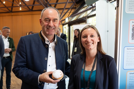 Auch der bayerische Wirtschaftsminister Hubert Aiwanger nahm sich Zeit für einen persönlichen Besuch des Krapfenbäcker-Infomobils. Regionalmanagerin Sonja Gerstenkorn nutzte die Gelegenheit, dem Minister das Erfolgsrezept Innenentwicklung vorzustellen und näher zu erläutern. Der lecker gefüllte Krapfen steht symbolisch für die ideale Ortsentwicklung mit lebendigen Dorf- und Stadtkernen, die vielfältige Funktionen bieten von Wohnen über Einkaufen und Arbeiten bis hin zu Gemeinschaft und Begegnung.