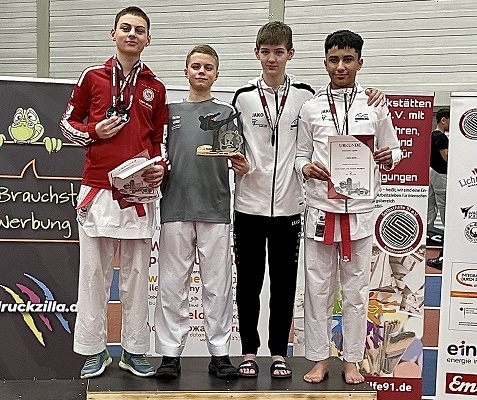 Foto 2: Triple-Gold-Gewinner: TG-Karateka Daniel Eckerdt (2.v.l.) bei der Siegerehrung in der offenen Gewichtsklasse der unter 14-Jährigen (Foto: Liudmila Eckerdt)