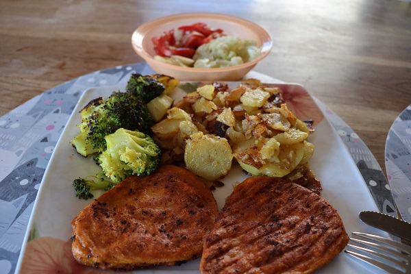 Diesmal war Petra noch auf der Arbeit und tischte dafür Mutter Ursula auf. Es gab Hacksteaks mit Bratkartoffeln, dazu Brokoli-Gemüse und Salat mit Tomaten, Sellerie und Blumenkohl. Also quasi fast vegane Kost, wären da nicht die bösen Hacksteaks gewesen, die unbedingt auf den Teller wollten.
