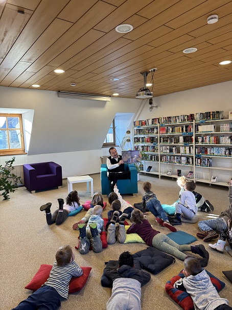 Mit großer Erzählfreude begeisterte Sabine Bromisch (Vorzimmer Bürgermeister) die Mondkinder mit dem Buch „Wie Henri Henriette fand “. Geschäftsleiter Stephan Renninger empfing die Jüngsten in der Kinderbuchabteilung und erzählte ihnen – veranschaulicht mit verschiedenen mitgebrachten Gegenständen – die Geschichte vom „Dorf der Schussel“.