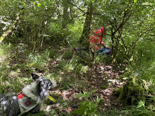 Ein Hund-Mensch-Team der Johanniter Rettungshundestaffel in Schweinfurt findet bei einer Übung die vermisste Person im Wald und führt die Erstversorgung durch.