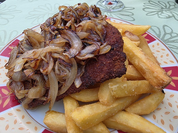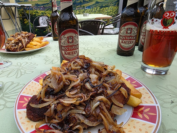 Und zu ganz vielen Zwiebeln auf einem Schnitzel bei einer Spezialität und dem aktuellen Lieblingsgericht der beiden Schonunger im Gasthaus Weißes Ross in Schnackenwerth direkt an der Hauptstraße, wo man bis in den Spätherbst hinein im überdachten Biergarten mitten in den Weinbergen sitzen kann.