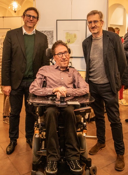 Oberbürgermeister Martin Heilig, Julian Wendel, 1. Vorsitzender des Würzburger Behindertenbeirats, und der Karikaturist Phil Hubbe (v.l.n.r.) bei der Ausstellungseröffnung im Oberen Foyer